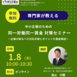 「派遣労働者の同一労働同一賃金」に関するセミナーで講師を務めました。 「同一労働同一賃金」制度自体は、正社員と非正規社員の間の不合理な待遇差解消を目的としており、中小企業にも2021年から既に適用されています。派遣労働者 […] - 令和7年度「働き方改革及び賃金引上げに向けた各種支援に関する説明会」(岡山労働局)