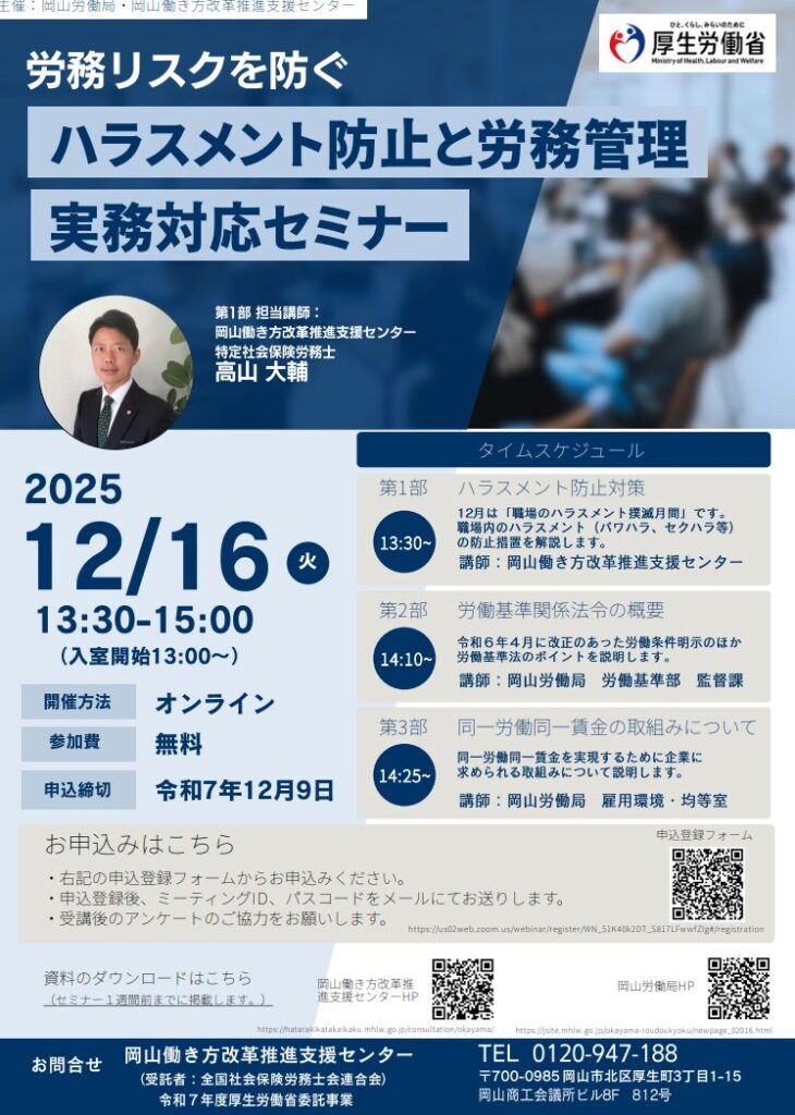 この度、岡山労働局・岡山働き方改革推進支援センターが主催する労務管理実務セミナーが開催されます。